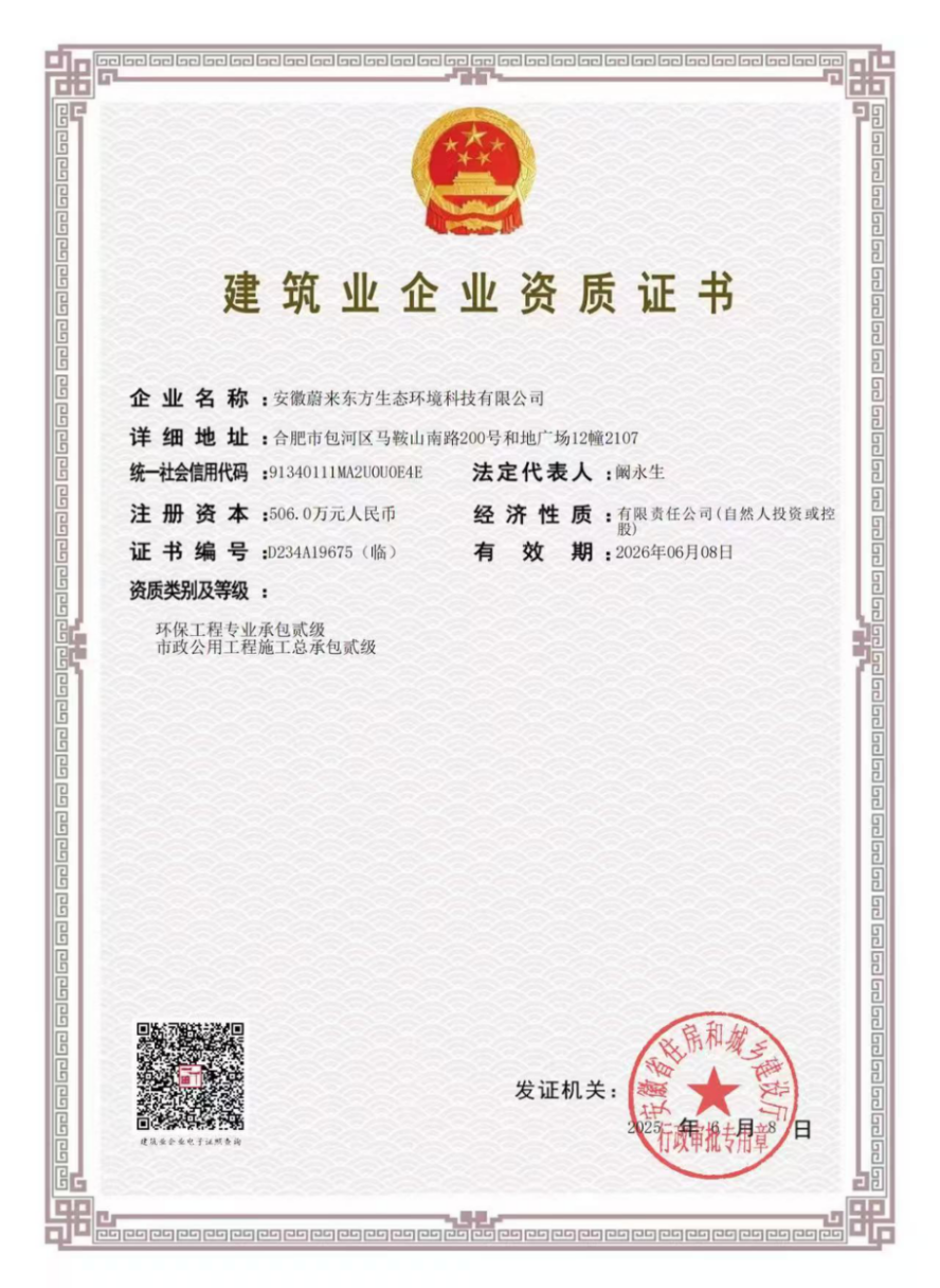 安徽蔚来东方生态环境科技有限公司是综合生态环境服务型企业,是安徽省高新技术企业。拥有市政公用工程施工总承包贰级、防雷检测乙级和环保工程专业承包贰级资质,在生态环境保护领域拥有专业的研发、设计、咨询、施工、运营团队。业务包括:农业生产设施建设运营、农业面源污染综合治理、建筑雷电防护检测、环保管家服务、环境 VOCs 治理、环境监理、竣工环保验收监测与调查、污染场地调查和修复、排污许可申报、环境保护规划与管理、环境风险应急预案以及环保工程设计、施工和运营等。拥有系统、科学的生态环境治理保护技术与实践经验,获多项专利。为客户提供高品质的专业服务,获得了主管部门和社会各界的高度肯定。